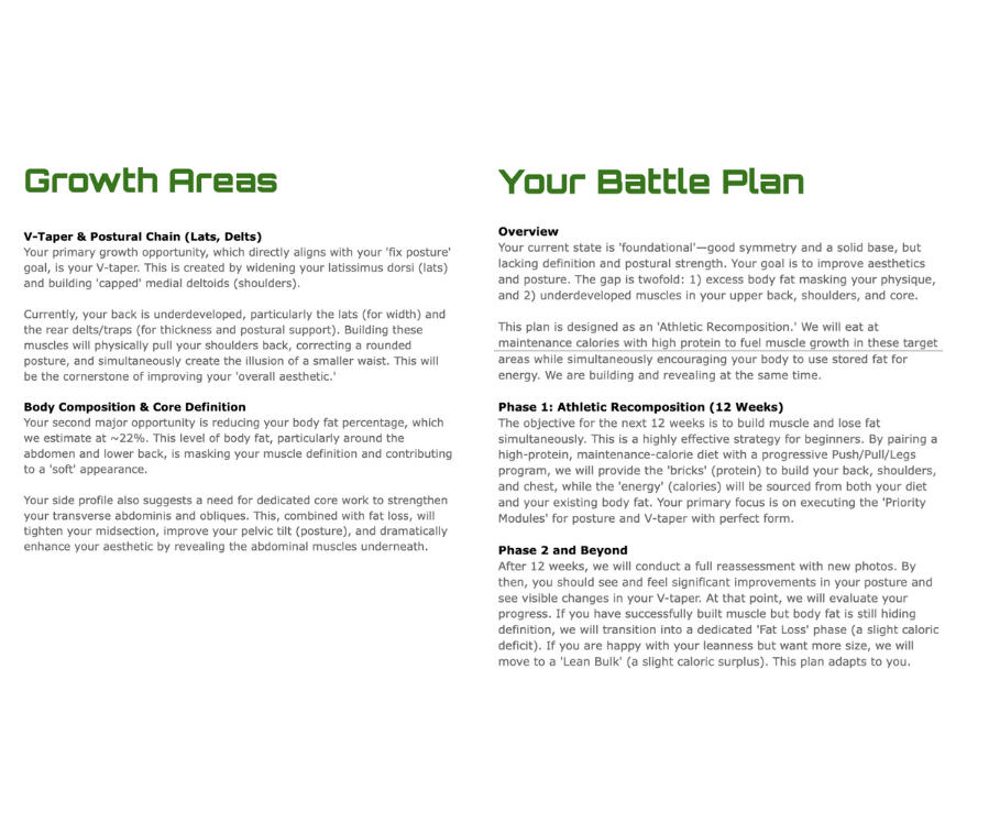 Our AI engine performs the initial scan, and our physique experts build your 10+ page Battle Plan.