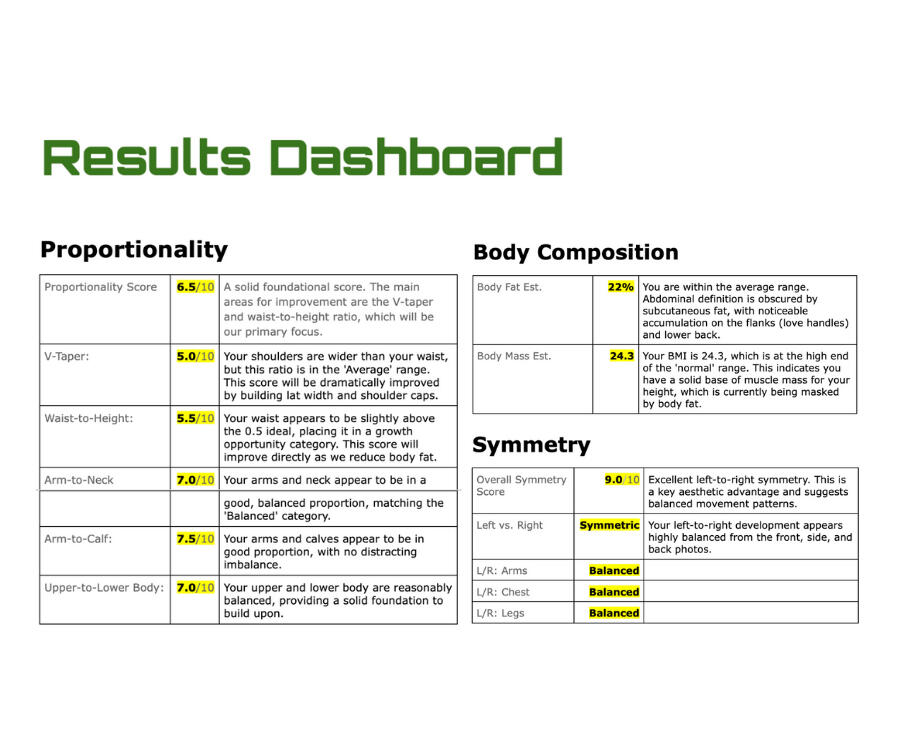 Our AI engine performs the initial scan, and our physique experts build your 10+ page Battle Plan.